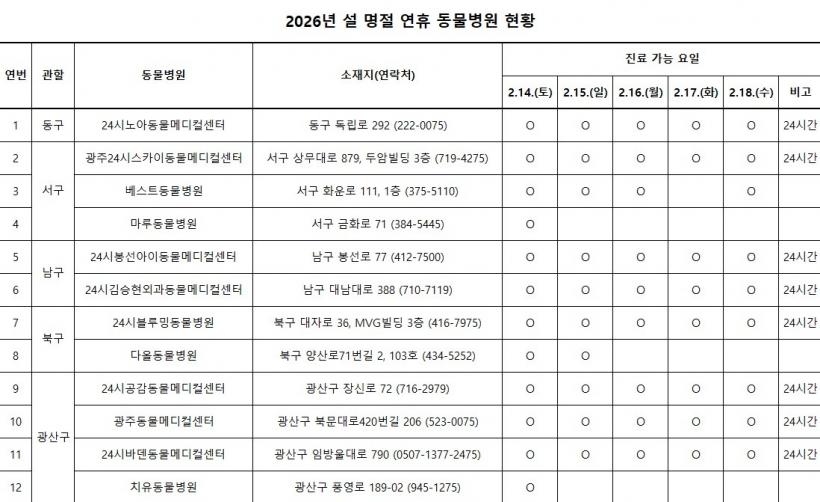 [°ø°£´º½º = ±è¼ö±Ù±âÀÚ] ±¤ÁÖ±¤¿ª½Ã(½ÃÀå °±âÁ¤)´Â ¼³ ¿¬ÈÞ ±â°£ÀÎ 14ÀϺÎÅÍ 18ÀϱîÁö ÀÀ±Þ µ¿¹°º´¿ø 12°³¼Ò(µ¿±¸ 1°³¼Ò, ¼±¸ 3°³¼Ò, ³²±¸ 2°³¼Ò, ºÏ±¸ 2°³¼Ò, ±¤»ê±¸ 4°³¼Ò) ¸¦ ¿î¿µÇÑ´Ù.