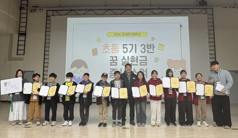 ¾Æ¿ï·¯, ¼ö·á½Ä¿¡¼´Â Á¤¼ºÈ£ ±âºÎÀÚ(¿ëÈ£ÁÖ½Äȸ»ç ´ëÇ¥)°¡ ²Þ µ¿¹ÝÀÚ·Î Âü¿©ÇØ Çлýµé¿¡°Ô ¡®²Þ ½ÇÇö±Ý¡¯ Áõ¼¸¦ ¼ö¿©Çß´Ù. Á¤ ´ëÇ¥´Â ¡°ÀÌ ±âºÎ±ÝÀÌ ¾ÆÀ̵éÀÌ ¿Á¤À» °®°í µµÀüÇÒ ¼ö ÀÖ´Â ¸¶Áß¹°ÀÌ µÇ±æ ¹Ù¶õ´Ù¡±¸ç ÀÀ¿øÀÇ ¶æÀ» ¹àÇû´Ù.