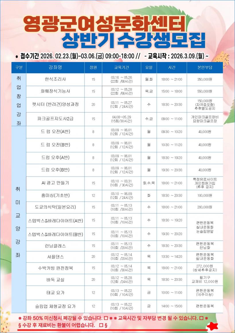 ÇÑÆí, 2026³â »ó¹Ý±â ¿©¼º¹®È¼¾ÅÍ ÇÁ·Î±×·¥Àº 3¿ù 6ÀϺÎÅÍ ¼øÂ÷ÀûÀ¸·Î °³°ÇÒ ¿¹Á¤À̸ç, °Áº° ¼¼ºÎ ÀÏÁ¤ µî ÀÚ¼¼ÇÑ »çÇ×Àº ¿µ±¤±º ȨÆäÀÌÁö ¶Ç´Â ¿µ±¤±º ¿©¼º¹®È¼¾ÅÍ(¢Ï353-5253), ¿µ±¤±º °¡Á¤Çູ°ú(¢Ï350-5547)¿¡¼ È®ÀÎÇÒ ¼ö ÀÖ´Ù.