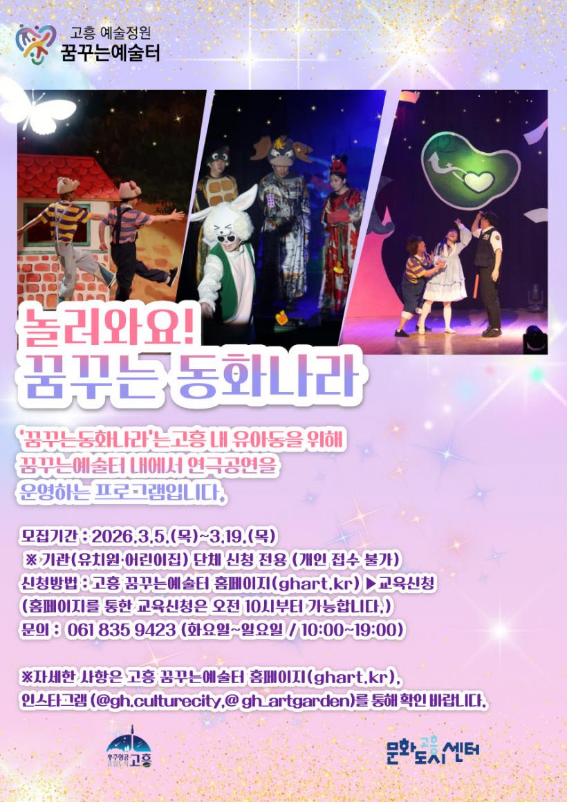 À̹ø °ø¿¬Àº °íÈï ²Þ²Ù´Â¿¹¼úÅÍ 2Ãþ ¸öÀÛ¾÷Àå¿¡¼ 4¿ùºÎÅÍ 6¿ù±îÁö ÃÑ 3ȸ¿¡ °ÉÃÄ ÁøÇàµÈ´Ù. Ã¥ ¼Ó¿¡¼¸¸ ¸¸³µ´ø µ¿È ¼Ó ÁÖÀΰøµéÀÌ ¹«´ë À§¿¡¼ »ý»ýÇÏ°Ô ÆîÃÄÁö´Â ¿¬ÃâÀ» ÅëÇØ, ¾î¸°À̵鿡°Ô ´Ü¼øÇÑ °ü¶÷À» ³Ñ¾î¼± Ưº°ÇÑ ¹®È¿¹¼ú üÇèÀ» ¼±»çÇÒ ¿¹Á¤ÀÌ´Ù.