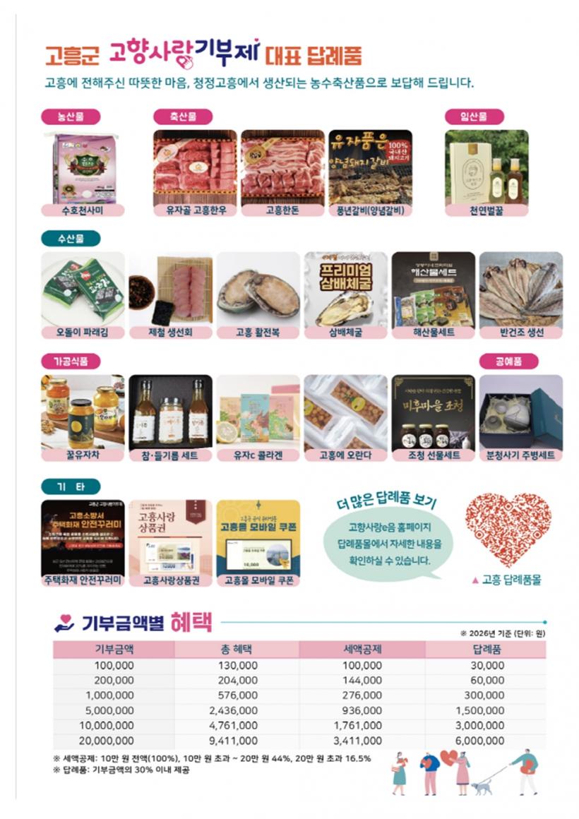 °íÇâ»ç¶û±âºÎÁ¦´Â 10¸¸ ¿ø±îÁö Àü¾× ¼¼¾×°øÁ¦°¡ Àû¿ëµÇ¸ç, 10¸¸ ¿ø Ãʰú 20¸¸ ¿ø ÀÌÇÏ ±âºÎ ½Ã 44% ¼¼¾×°øÁ¦ ÇýÅÃÀÌ ÀÖ´Ù. ¶ÇÇÑ ±âºÎ±ÝÀÇ 30% À̳»¿¡¼ Áö¿ª Ư»ê¹° ´ä·ÊǰÀ» ¹ÞÀ» ¼ö ÀÖ´Ù. ÇöÀç °íÈï Çѿ츦 ºñ·ÔÇØ ½Ò, À¯ÀÚ °¡°øÇ°, ¸¶¸¥±è, ²Ü µî Áö¿ªÀ» ´ëÇ¥ÇÏ´Â ³ó¼öƯ»ê¹°ÀÌ ´ä·ÊǰÀ¸·Î Á¦°øµÇ°í ÀÖ´Ù.