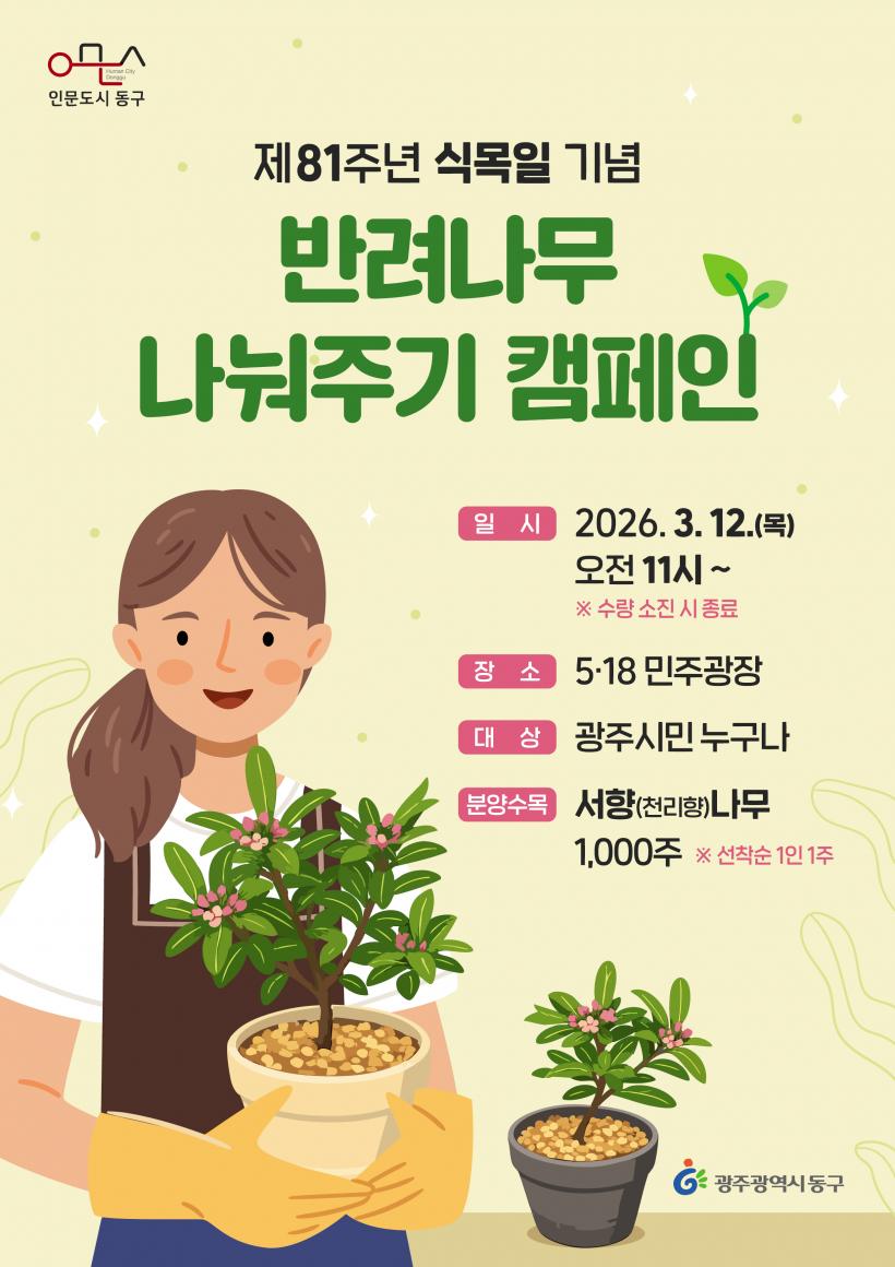 µ¿±¸´Â À̳¯ ¿ÀÀü 11½ÃºÎÅÍ ¼Ç⳪¹«(õ¸®Çâ) 1,000ÁÖ¸¦ 1ÀÎ 1±×·ç¾¿ ¼±Âø¼øÀ¸·Î ¹«·á ºÐ¾çÇÑ´Ù. ±¸´Â À̹ø Çà»ç¸¦ ÅëÇØ ¡®1ÀÎ 1³ª¹« °¡²Ù±â¡¯¸¦ Àû±Ø È«º¸ÇÔÀ¸·Î½á, ÀÏ»ó ¼Ó¿¡¼ ±âÈÄÀ§±â ±Øº¹À» ½ÇõÇÏ°í ³ì»öµµ½Ã Á¶¼º¿¡ ±â¿©ÇÒ °ÍÀ¸·Î ±â´ëÇϰí ÀÖ´Ù.