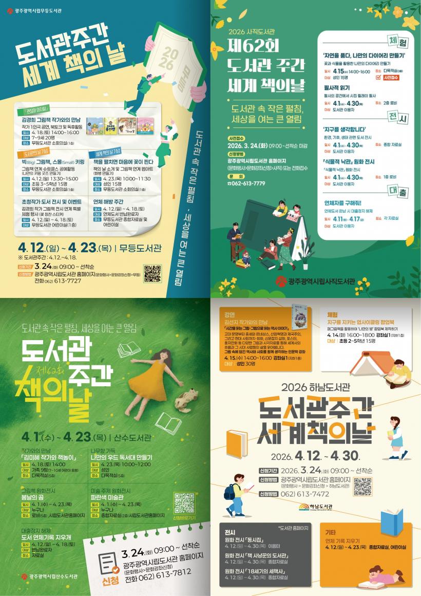 °¿¬¡¤Ã¼Çè ÇÁ·Î±×·¥ Âü°¡ ½ÅûÀº 3¿ù 24ÀϺÎÅÍ ½Ã¸³µµ¼°ü ´©¸®Áý ¡®¹®È°Á ½Åû¡¯ ¸Þ´º¿¡¼ ÇÏ¸é µÈ´Ù. ÀÚ¼¼ÇÑ »çÇ×Àº ´©¸®Áý(https://citylib.gwangju.go.kr)À» Âü°íÇϰųª ¹«µî(613-7727), »çÁ÷(613-7779), »ê¼ö(613-7812), Çϳ²(613-7472) µµ¼°üÀ¸·Î ¹®ÀÇÇÏ¸é µÈ´Ù.