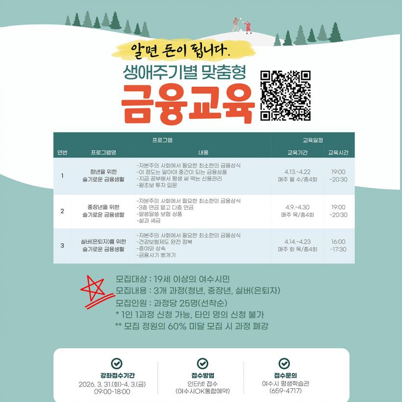 Âü¿© ½ÅûÀº 3¿ù 31ÀϺÎÅÍ 4¿ù 3ÀϱîÁö ¿©¼ö½Ã OKÅëÇÕ¿¹¾à½Ã½ºÅÛÀ» ÅëÇØ °¡´ÉÇϸç, ¿©¼ö½Ã¹Î ´©±¸³ª ½ÅûÇÒ ¼ö ÀÖ´Ù. ÀÚ¼¼ÇÑ »çÇ×Àº ¾È³»¹®À» Âü°íÇϰųª ¿©¼ö½Ã Æò»ýÇнÀ°ü(¢Ï061-659-4717)À¸·Î ¹®ÀÇÇÏ¸é µÈ´Ù.