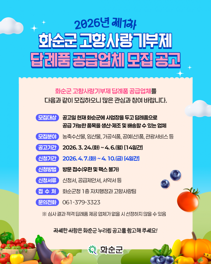ÀÚ¼¼ÇÑ ³»¿ë°ú ½Åû ¼½ÄÀº ȼø±ºÃ» ´©¸®Áý °í½Ã¡¤°ø°í¶õ¿¡¼ È®ÀÎÇÒ ¼ö ÀÖÀ¸¸ç, ±âŸ ¹®ÀÇ´Â ÀÚÄ¡ÇàÁ¤°ú °íÇâ»ç¶ûÆÀ(¢Ï061-379-3323)À¸·Î ÇÏ¸é µÈ´Ù.