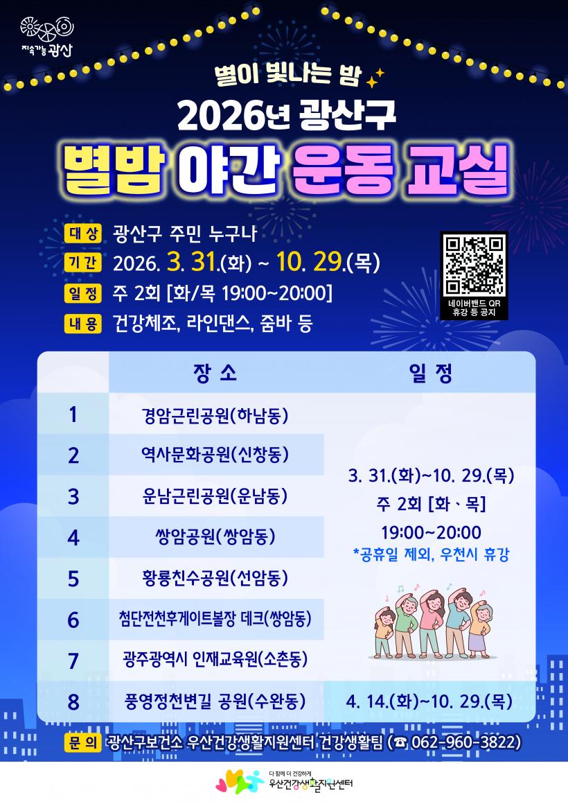 º°¹ã¾ß°£¿îµ¿±³½ÇÀº ³²³à³ë¼Ò ´©±¸³ª ¹«·á·Î Âü¿©ÇÒ ¼ö ÀÖ´Â °Ç° üÁ¶·Î, ±¤»ê±¸ 8°³ °ø¿ø¿¡¼ È¿äÀϰú ¸ñ¿äÀÏ ÁÖ 2ȸ ¿ÀÈÄ 7½ÃºÎÅÍ 8½Ã±îÁö ÁøÇàÇÑ´Ù.