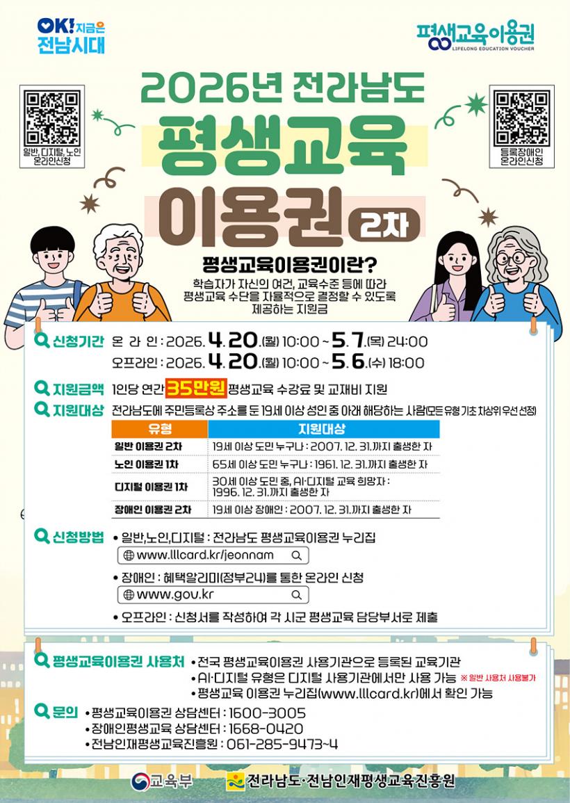 ½Åû ±â°£Àº 4¿ù 20ÀϺÎÅÍ 5¿ù 6ÀϱîÁö¸ç Æò»ý±³À°ÀÌ¿ë±Ç ´©¸®Áý(www.lllcard.kr)¿¡¼ ¿Â¶óÀÎ Á¢¼ö ¶Ç´Â ¿©¼ö½Ã Æò»ýÇнÀ°ü(¢Ï061-659-4717)À¸·Î ¹æ¹® Á¢¼ö·Î °¡´ÉÇÏ´Ù.